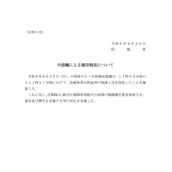 日本防卫省通报称,8月26日上午11:29分,一架解放军运-9侦察机进入了日本长崎县男女群岛的近海领空,时间持续了约2分钟,在11:31分飞出。自卫队起飞了战斗机对运-9飞机进行了警告和驱离。